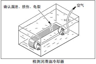在三菱S6R發動機冷卻器芯的潤滑油通道部位,進行1.5MPa{15 kgf/cm2} 的壓縮空氣測試,檢查芯部的損傷或龜裂。發現有漏泄時,更換新的冷卻器芯。