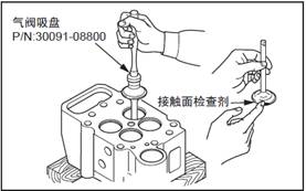 在三菱S6R柴油發(fā)動(dòng)機(jī)氣閥門(mén)的接觸面薄涂一層檢查劑( 不含鉛的著色劑),用三菱S6R柴油發(fā)動(dòng)機(jī)氣閥門(mén)吸盤(pán)檢查三菱S6R柴油發(fā)動(dòng)機(jī)氣閥門(mén)和閥座接觸面的吻合狀況。發(fā)現(xiàn)接觸面不同或異常,或超過(guò)極限值時(shí),修正或更換新品三菱S6R柴油發(fā)動(dòng)機(jī)氣閥門(mén)或閥座。