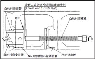 (4) 在三菱S6R柴油發動機凸輪軸襯套螺栓的前端( 和三菱S6R柴油發動機凸輪軸襯套安裝器的接觸部分) 涂敷二硫化鉬系耐高溫潤滑劑( 類似于ThreeBond 1910)。
