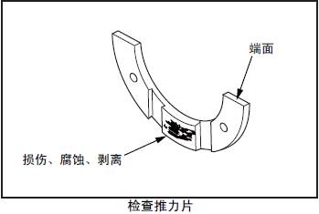 檢查三菱S12柴油發動機推力片的接觸面、背面和端面,如有接觸不良、滑動損傷、腐蝕、異物嵌入等異常時更換新品。