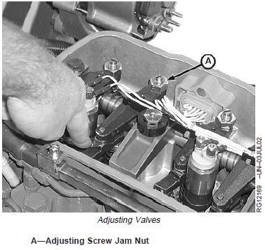 5. If valves need adjusting, use the appropriate valveclearance adjustment procedure on the next page andadjust to specifications below. Loosen the jam nut (A)on rocker arm adjusting screw. Turn adjusting screw until feeler gauge slips with a slight drag. Hold the adjusting screw from turning with screwdriver and tighten jam nut to specifications. Recheck clearance again after tightening jam nut. Readjust clearance as necessary.