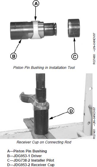 1. Use JD286 (JD-286) Piston Pin Bushing Remover and Installer for 41 mm (1.6 in.) pin or JDE88 Piston Pin Bushing Remover and Installer for 35 mm (1.3 in.) pin to install bushing.