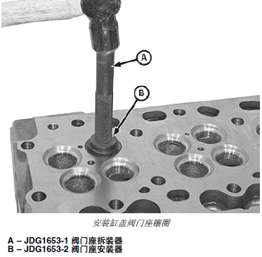 1. 用 JDG1653-1 閥門座孔拆裝器(A) 和 JDG1653-2 閥門座孔鑲?cè)Π惭b器(B) 安裝缸蓋閥門座孔鑲?cè)ΑS?JDG1653-2 閥門座安裝器的一端安裝進(jìn)氣閥門座鑲?cè)Γ昧硪欢税惭b排氣閥門座鑲?cè)Α?/P>