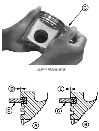 1. 使用合適的活塞環(huán)槽磨損量具 (C) 檢查梯形環(huán)槽(上槽)的磨損程度。在活塞四周多個(gè)測(cè)量點(diǎn)檢查環(huán)槽。量規(guī)肩部不能與活塞環(huán)口接觸。量規(guī)肩部與活塞環(huán)口有間隙 (D) 表明活塞環(huán)槽狀態(tài)良好。如果活塞環(huán)槽磨損,應(yīng)成套更換活塞和汽缸套。如果活塞環(huán)槽完好,應(yīng)繼續(xù)執(zhí)行下面的步驟。
