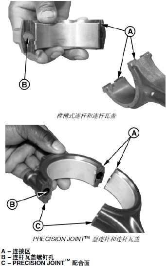 重要提示: 不得劃傷連桿和連桿瓦蓋的連接面。對于確保 PRECISION JOINT™ 連桿正確安裝來說,這是非常重要的。禁止用鋼絲刷或其他工具刷連接面 (C)。必須保護互鎖配合面。