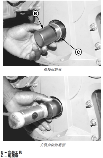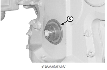 重要提示: 為保證安裝正確,曲軸和耐磨套外徑必須要用 Brake Kleen、IgnitionCleaner 或等效產(chǎn)品進(jìn)行清洗,風(fēng)干后再安裝油封 (C)。