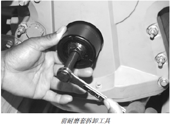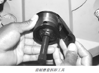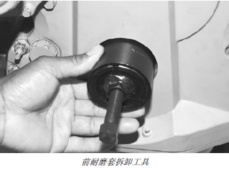 注意: 如果拆卸過(guò)程中耐磨套的凸輪緣開(kāi)始滾動(dòng),應(yīng)卸下拉拔器總成,使用更寬爪的夾頭卡住耐磨套。