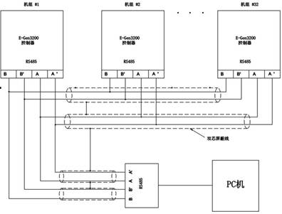 并機(jī)系統(tǒng)中的機(jī)組之間的起停順序、負(fù)載分配、開關(guān)閉合時(shí)間等各種功能都是通過各并機(jī)并網(wǎng)并聯(lián)控制器的數(shù)據(jù)聯(lián)機(jī)進(jìn)行通信,然后由控制器進(jìn)行數(shù)據(jù)處理并發(fā)出相應(yīng)控制命令,從而實(shí)現(xiàn)對各機(jī)組的并車控制。通信采用 RS-485網(wǎng)絡(luò),其在并機(jī)并網(wǎng)并聯(lián)控制器中的聯(lián)機(jī)示意圖如下: