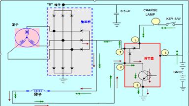 發(fā)動機 IDLE期間引加急劇電流則調(diào)節(jié)器防止發(fā)動機IDLE速度,并為了避免發(fā)動機負(fù)載的突然增大,而把轉(zhuǎn)子激磁電流切斷以后逐漸增加電流來減少發(fā)動機的速度變化. 依據(jù)此動作 調(diào)節(jié)器在提高燃比和減少 排廢氣及改善乘車感的方面作出貢獻.