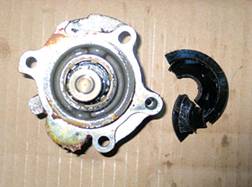 (1)葉輪損壞 葉輪損壞的常見形式有葉輪開裂、葉輪從泵軸上松脫或葉輪腐蝕,葉輪腐蝕一般不會(huì)造成發(fā)動(dòng)機(jī)故障。葉輪開裂或葉輪從泵軸上松脫后,冷卻液循環(huán)速度變慢,容易引起發(fā)動(dòng)機(jī)溫度過高的故障。損壞的葉輪在旋轉(zhuǎn)時(shí)還可能撞擊水泵殼體,造成殼體碎裂。