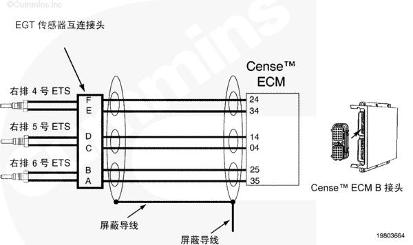 當鑰匙處于 ON(接通)或者康明斯發動機運轉時,可以使用 Insite™ 來監測排氣溫度傳感器的溫度值以快速檢查電路圖工作情況。有三個傳感器連接到右排線束上的一個接頭。為了進行系統快速檢查,從有故障代碼的傳感器上斷開傳感器接頭。INSITE™ 讀取到的所有傳感器溫度,除了 9 號排氣溫度傳感器之外,都應為非常低。如果斷開了與 7 號和 8 號排氣溫度傳感器相關的接頭,則 9 號排氣溫度傳感器讀取到的溫度值會非常高。短接每個傳感器的傳感器觸針“排氣溫度傳感器信號(正極)和排氣溫度傳感器信號(負極)”。Insite™ 中新的冷連接點處同一接頭上的傳感器的溫度讀數都將近似相同。這表示線束、熱電偶放大器和 CENSE™ ECM 正常工作,但傳感器有故障。如果接頭、線束、熱電偶放大器或者 CENSE™ ECM 有間歇性、故障或者腐蝕的連接,則有故障代碼的排氣溫度傳感器的溫度值響應將不會如上所述。將需要對系統的其余部分進行故障診斷以確定有故障的部件。該過程假定同一個傳感器接頭上的所有三個傳感器都沒有故障代碼。