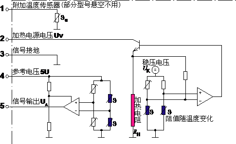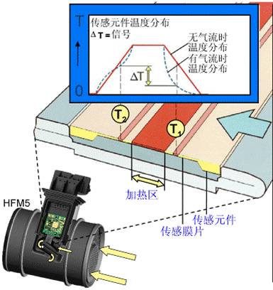熱膜式空氣流量計是一個帶有邏輯輸出的空氣質(zhì)量傳感器,為了獲得空氣流量,傳感器元件上的傳感器膜片被中間安裝的加熱電阻加熱,膜片上的溫度分配被與加熱電阻平行安裝的溫度電阻測量。通過傳感器的氣流改變了膜片上的溫度分配,從而使得兩個溫度電阻的電阻值產(chǎn)生差異。電阻值的差異取決于氣流的方向和流量,因此空氣流量傳感器對空氣的流量和方向具有較高的要求。微機(jī)械制造的傳感器元件的小尺寸和較低的熱容量式的傳感器的響應(yīng)時間<15ms。如需要可以在傳感器內(nèi)部安裝進(jìn)氣溫度傳感器,用以測量進(jìn)氣溫度。