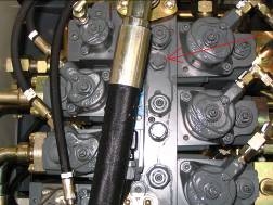 應(yīng)為390 bar,否則調(diào)節(jié)工作閥塊動臂調(diào)節(jié)螺釘 ,如下圖里側(cè)螺釘。