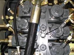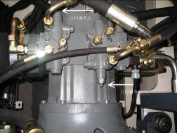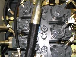 斷開回轉(zhuǎn)馬達(dá)制動油口,如下圖。在斷開的油管上接一測口,在斷開的馬達(dá)接頭處接堵頭。