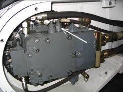 按下控制屏上“壓力等級”鍵,大臂升到極限。測泵1的壓力,調(diào)下圖的內(nèi)六角螺釘使壓力達(dá)到380 bar,