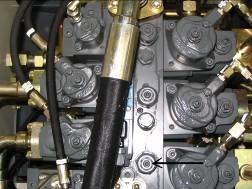 按下控制屏上“F3”鍵,快速回收鏟斗,讀出回油壓力,應(yīng)為90--100 bar,如果達(dá)不到,就調(diào)工作閥塊第二個黑六角螺釘,如下圖。