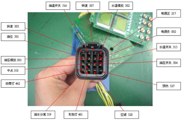 15、按鍵燈光輸出檢測:在儀表上電的情況下,按動燈光按鍵一次,儀表如圖1護套(461號線)接頭輸出對地12V電壓,燈光相應指示燈點亮;按動燈光按鍵二次,儀表如圖護套(462號線)接頭輸出對地12V電壓,燈光相應指示燈點亮;按動燈光按鍵三次,儀表462號線和461號線接頭均輸出對地12V電壓,燈光兩指示燈同時點亮,說明儀表行走輸出正常。
