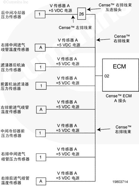 康明斯QSK78電子控制模塊 (ECM) 通過(guò) CENSE™ ECM A 接頭上的觸針 01 向 CENSE™ 線(xiàn)束上的傳感器提供 +5 VDC 供電。當(dāng)一個(gè)接地或回路短接到 +5 VDC 電路圖時(shí),所有連接到該傳感器的電源都會(huì)發(fā)生多個(gè)故障。發(fā)生這種情況是因?yàn)樗羞B接到該電源的部件信號(hào)電路圖電壓將短路到零伏或低于該部件的超出正常范圍(低壓短路)閾值。
