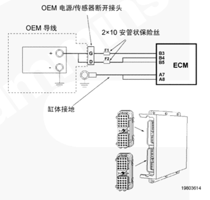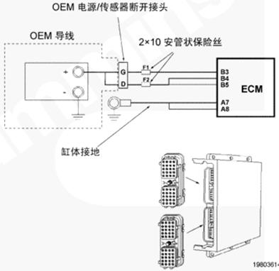 CM500 ECM 通過(guò) OEM 線(xiàn)束和康明斯QSK78發(fā)動(dòng)機(jī)線(xiàn)束接收無(wú)開(kāi)關(guān)蓄電池電壓。OEM 接口線(xiàn)束的無(wú)開(kāi)關(guān)蓄電池導(dǎo)線(xiàn)中有兩個(gè)個(gè)串聯(lián)式 10 安培保險(xiǎn)絲,以保護(hù) CM500 ECM。康明斯QSK78發(fā)動(dòng)機(jī)線(xiàn)束中的蓄電池回路導(dǎo)線(xiàn)連至康明斯QSK78發(fā)動(dòng)機(jī)缸體接地。