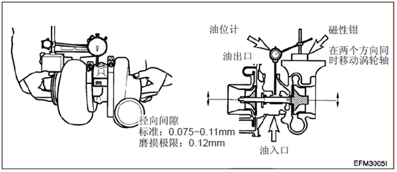 從發動機上拆下渦輪增壓器,然后檢查轉子軸向間隙或徑向間隙。拆下發動機時,確保塞好進油和出油端口。