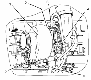 將管組件 (2) 和密封墊(未顯示)放置到位。將固定管組件的螺栓擰緊至扭矩為 25 ± 6 N·m (18 ± 4 lb ft)。 將螺栓擰緊至最終扭矩 47 ± 9 N·m (35 ± 6 lb ft)。