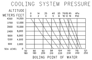 溫度和壓力協同作用。在對冷卻系統的故障進行診斷時,必須檢查溫度和壓力。冷卻系統的壓力影響冷卻系統溫度。例如,請參閱圖1。圖中顯示了水的沸點(蒸汽)和高于海平面的高度對壓力的影響。