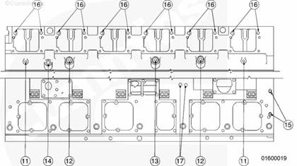 對缸體進行了改動以便能夠安裝較長的缸蓋螺釘。以前的康明斯發動機必須使用長度為 171 mm [6.73 in] 的螺釘。現在的康明斯發動機必須使用長度為 203 mm [8.00 in] 的螺釘。短螺釘可用于維修。這些螺釘都是鍍鎘的(銀色或金色)。必須將這些短螺釘擰緊至 353 N•m [260 ft-lb]。如果短螺釘表面具有 lubrite 鍍層,而且顏色是黑色,則必須予以更換。203 mm [8 in] 螺釘只能使用 lubrite 鍍層。555 N•m [409 ft-lb] 扭矩必須施加在這些螺釘上。K50 康明斯發動機總是使用 203 mm [8.00 in] 螺釘。
