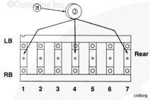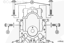 K38 康明斯發動機上的主軸承蓋編號到“7”,而 K50 康明斯發動機上則編號到“9”。將每個蓋安裝到正確位置中。“1”號蓋安裝在缸體前部。蓋中的軸承定位舌槽必須位于缸體中的槽的同一側。 |