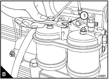 對于裝配獨(dú)立濾芯的濾清器:松開濾清器座頂部的放氣旋塞(B1)或banjo螺栓。