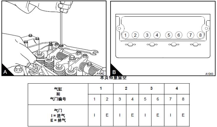 3設置1號氣缸的氣門(B1和B2)。然后檢查/調整4號氣缸的氣門(B7和B8)間隙。