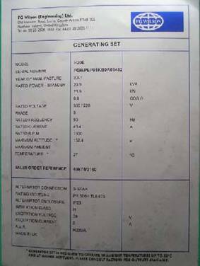 每一臺柴油發(fā)電機(jī)組都有一個銘牌,它被粘貼在主交流發(fā)電機(jī)的外殼上或機(jī)組控制屏的背后。銘牌上的資料用于鑒別該機(jī)組的型號、編號及簡單技術(shù)特性,如額定轉(zhuǎn)速、額定電壓、電流和額定頻率、額定功率、額定功率因數(shù)及機(jī)組的標(biāo)準(zhǔn)測試條件如環(huán)境溫度和海拔高度等。為了向用戶提供更詳細(xì)參考,一些資料還會重復(fù)在隨本手冊附送的技術(shù)數(shù)據(jù)表內(nèi)。
