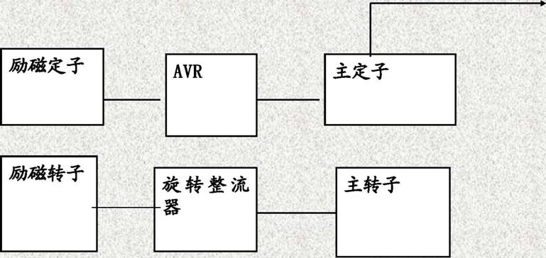 柴油機(jī)著車并帶動發(fā)電機(jī)旋轉(zhuǎn),主轉(zhuǎn)子的剩磁產(chǎn)生一個小的交流電壓加到主定子上,AVR將其整流轉(zhuǎn)為直流并將其加到勵磁定子上。此直流電和勵磁定子間就產(chǎn)生一個磁場,磁場又依次在勵磁轉(zhuǎn)子上感應(yīng)出一個交流電(AC),此AC又由旋轉(zhuǎn)整流器轉(zhuǎn)變?yōu)橹绷麟?。?dāng)這直流電壓經(jīng)過主轉(zhuǎn)子時,就產(chǎn)生一個比原來的剩磁強(qiáng)大的磁場,因而在主定子上感應(yīng)出一個較高的交流電壓。這個較高的交流電壓循環(huán)通過系統(tǒng)感應(yīng)出更高的直流電壓回到轉(zhuǎn)子,這樣循環(huán)往復(fù)直到產(chǎn)生一個接近發(fā)電機(jī)的額定輸出電壓,在此時AVR開始限制通向勵磁定子的電壓,因而穩(wěn)定了發(fā)電機(jī)組的額定輸出電壓。