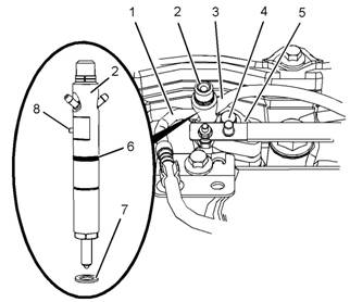 6拆下螺栓(4)。從噴油器(2)上卸下卡箍(5)。