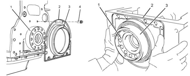 3提供的新曲軸后油封帶有一個塑料套管(3)。確保安裝時塑料套管的四個角在曲軸后油封(2)以內。