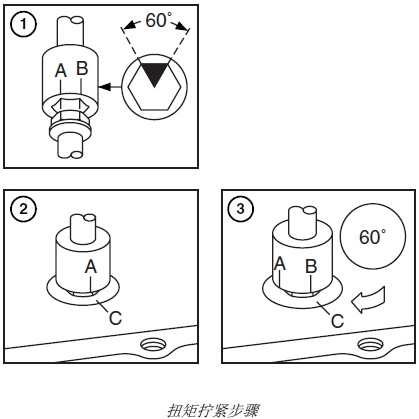 第 4 步-最后-扭矩 . . . . . . 將每個螺釘再扭轉 60° ± 10°。(參見本章的“用扭矩角度盤擰至正確扭矩”部分。)