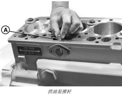 1. 安裝缸蓋前,在供油泵推桿 (A) (如果裝備)上涂抹干凈的John Deere約翰迪爾強鹿柴油發動機潤滑油,然后小心地裝到缸體中。