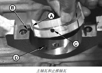 1. 安裝主軸瓦。軸瓦的榫塊 (A) 一定要插到軸瓦座和主軸瓦蓋的槽口 (B) 中。同時,軸瓦的油孔 (C) 要與軸瓦座的油孔 (D) 對齊。