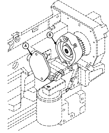 5. 拆下帶帽螺釘 (A) 和凸輪軸起動供油泵。參見CTM217 (機械燃油系統)第 02 部分第 090 章“拆卸供油泵”、CTM341(配 Stanadyne DE10 泵的 12級電子燃油系統)第 02 部分第 090 章“拆卸供油泵”或 CTM230 (配 Denso 高壓共軌的 11 級電子燃油系統)第 02 部分第 090 章“拆卸機械輸油泵”。