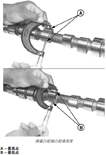 1. 在最高點 (A) 和最低點 (B) 分別測量每個凸輪緣。它們尺寸之間的差別就是凸輪軸凸輪緣高度。如果凸輪軸上任一凸輪緣的高度不符合技術規格的要求,應安