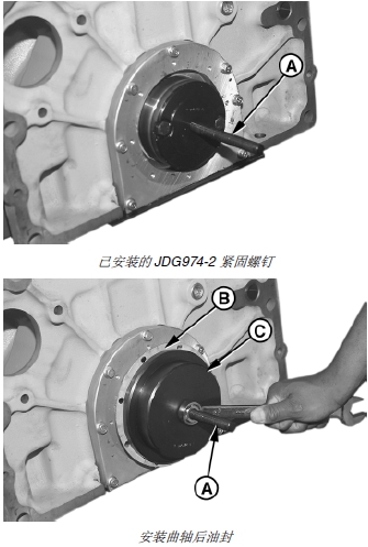 3. 將 JDG975 正時齒輪室蓋/ 后油封箱定位器 (C) 較大的一端安裝曲軸后凸緣上,錐形定位器 (D) 應位于時鐘 3 點和 9 點的位置。