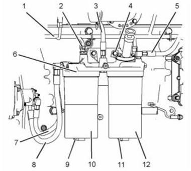 6. 使用帶1/2“方頭驅(qū)動(dòng)的適當(dāng)工具拆下燃油濾清器總成(10)和(12)。拆下O形密封圈。拆下燃油濾清器濾芯。有關(guān)更多信息,請(qǐng)參閱操作和保養(yǎng)手冊(cè)“燃油濾清器-更換”。