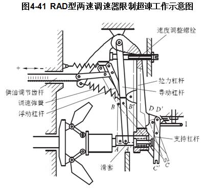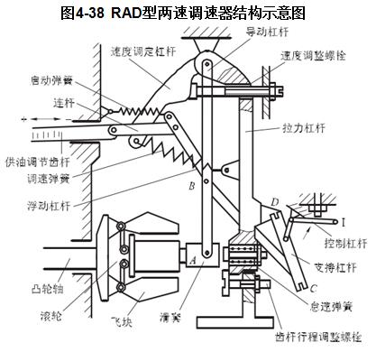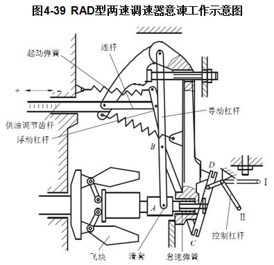圖4 - 37所示為CA1091 K3型載貨汽車柴油機所用的RAD型兩速調速器,其調速原理結構示意圖如圖4-38所示。