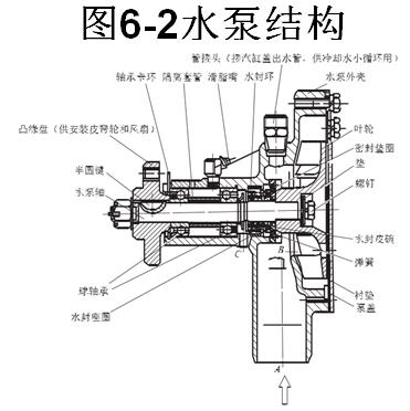 水泵進(jìn)水管通過(guò)軟管與散熱器下水室連通,冷卻液直接進(jìn)入水泵腔室的中央部位。在水泵中央部位安裝有管接頭,通過(guò)旁通管與節(jié)溫器副閥門(mén)連通。從副閥門(mén)流出的冷卻液通過(guò)該管接頭直接進(jìn)入水泵腔室。水泵腔室后側(cè)用泵蓋封閉,泵蓋上的出水口正對(duì)水泵泵腔的出水室。將水泵固定于發(fā)動(dòng)機(jī)后,泵蓋上的出水口與水套的分水管進(jìn)水口對(duì)接。在泵殼的油封與軸承座孔之間設(shè)有泄水孔,當(dāng)水封有少量的水滴泄漏時(shí),可以從該孔泄出。若當(dāng)發(fā)動(dòng)機(jī)熄火后仍然有水泄出,則應(yīng)拆開(kāi)水泵進(jìn)行修理。
