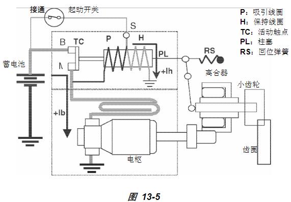 將鑰匙開(kāi)關(guān)轉(zhuǎn)到起動(dòng) (START) 位置就會(huì)向 S 端子施加蓄電池電壓 Vb。從而,電流流過(guò)吸引線圈 P 和保持線圈 H(分別是 +Ip和 +Ih),兩個(gè)線圈都吸引柱塞 PL。因此,小齒輪沖出,與齒圈嚙合。活動(dòng)觸點(diǎn) TC 同時(shí)與觸點(diǎn) B 和 M 接觸。