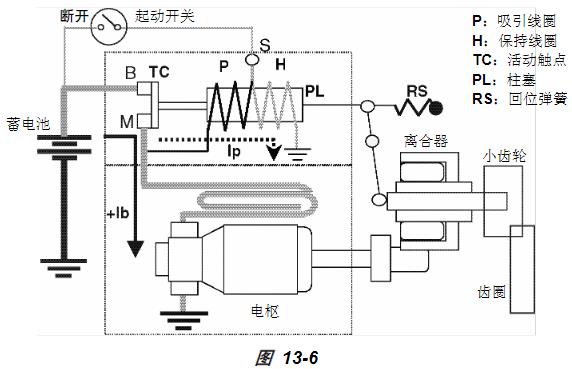 此時(shí),S 端子上的蓄電池電壓 Vb消失。另一方面,蓄電池電壓 Vb會(huì)施加到觸點(diǎn) M 上。因此,電流從觸點(diǎn) M 經(jīng)吸引線圈 P 流到保持線圈 H,最終流向接地。在(圖 13-6)所示的狀態(tài)下,