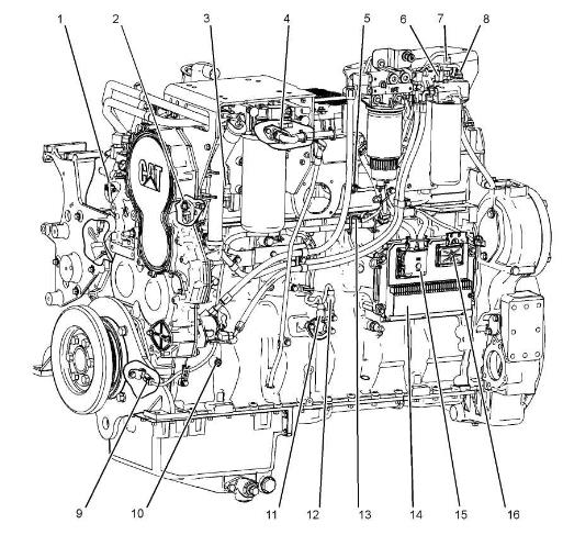 圖4發動機左側視圖(范例)(1) 發動機冷卻溫度傳感器(2) 次速度/時間感應塞(3) 進氣歧管壓力傳感器(4) 噴油器閥蓋進口接頭(5) 進氣歧管空氣溫度傳感器(6) 壓差開關(燃油)(7) 燃油壓力感應塞(8) 燃油溫度傳感器(9)主速度/時間感應塞(10) 正時校準口(11) 大氣壓力感應塞(12) 機油壓力感應塞(13) 正時校準探針接口(14) 發動機控制模塊(ECM)(15) J2/P2 ECM 接頭 (16) J1 ECM 接頭