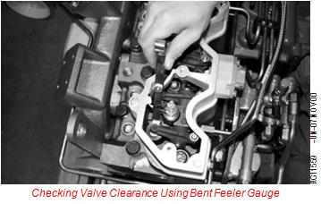 7. With engine lock-pinned at “TDC” of No. 1 piston’s compression stroke, use a bent feeler gauge to check valve clearance on Nos. 1, 3, and 5 exhaust valves and Nos. 1, 2, and 4 intake valves.