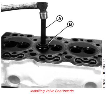 1. Use the JDE7 Driver (A) along with JDG605 Valve Seat Installer (B) to drive inserts into place. The larger end of JDG605 Installer is used to install intake valves and the smaller end is used to install exhaust valves.