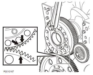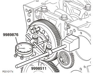 7 使用9999696 磁力架和 9989876 千分表檢查曲軸軸向游隙。使用 9998511 桿來回移動曲軸。讀取千分表上的值并對比技術數據。