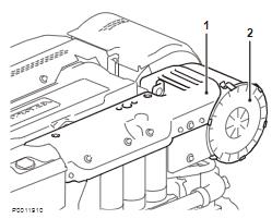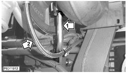 8 拆下回油管(1)和電纜結。拆下用于冷卻水的下部冷卻劑軟管(2)。